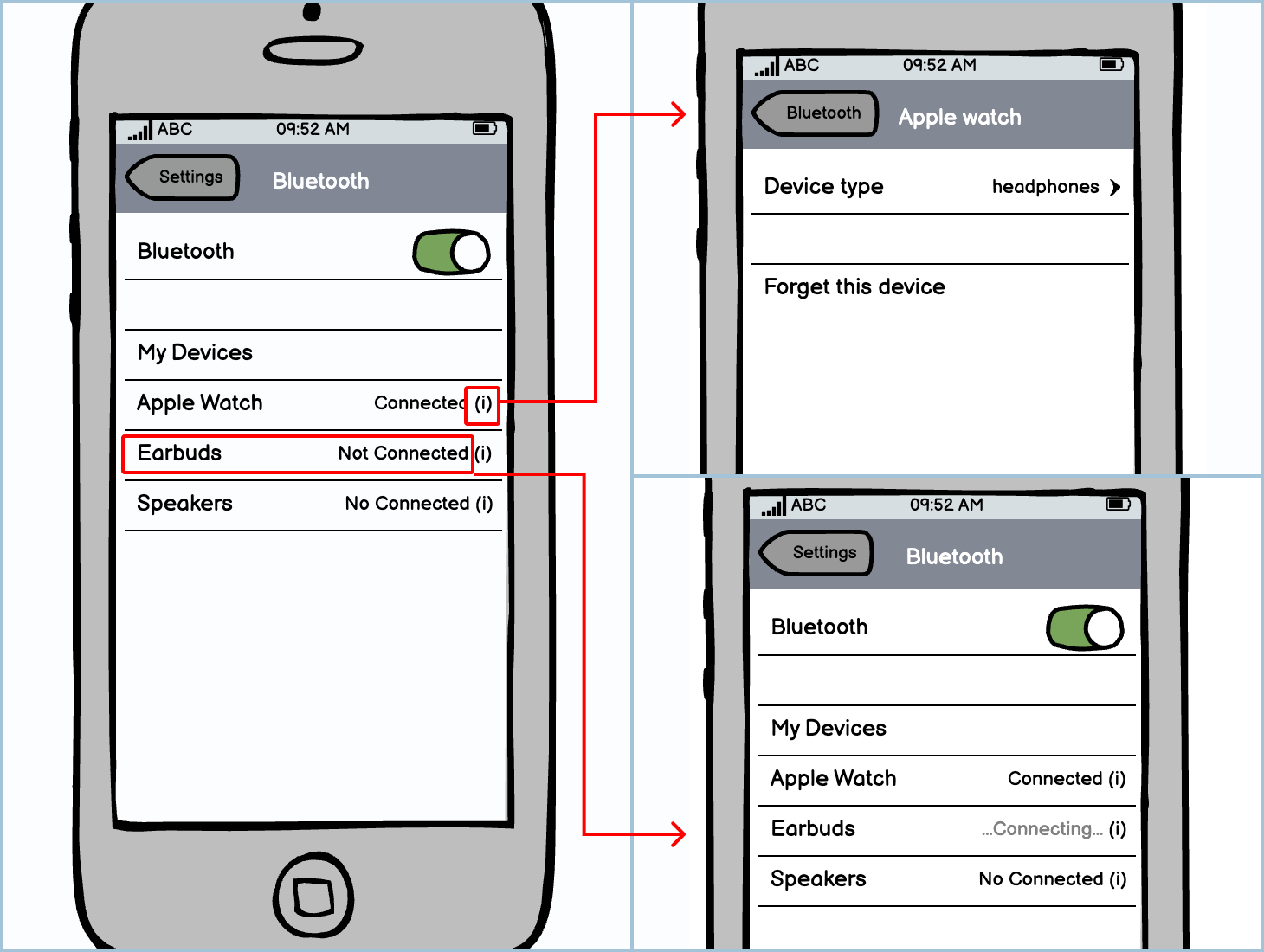 Sometimes text can work like a toggle, as we can see in the example below. If you tap the words “Not Connected”, it will trigger an event to try to connect the earbuds. If you tap the info icon, it will take you to a submenu with more information.