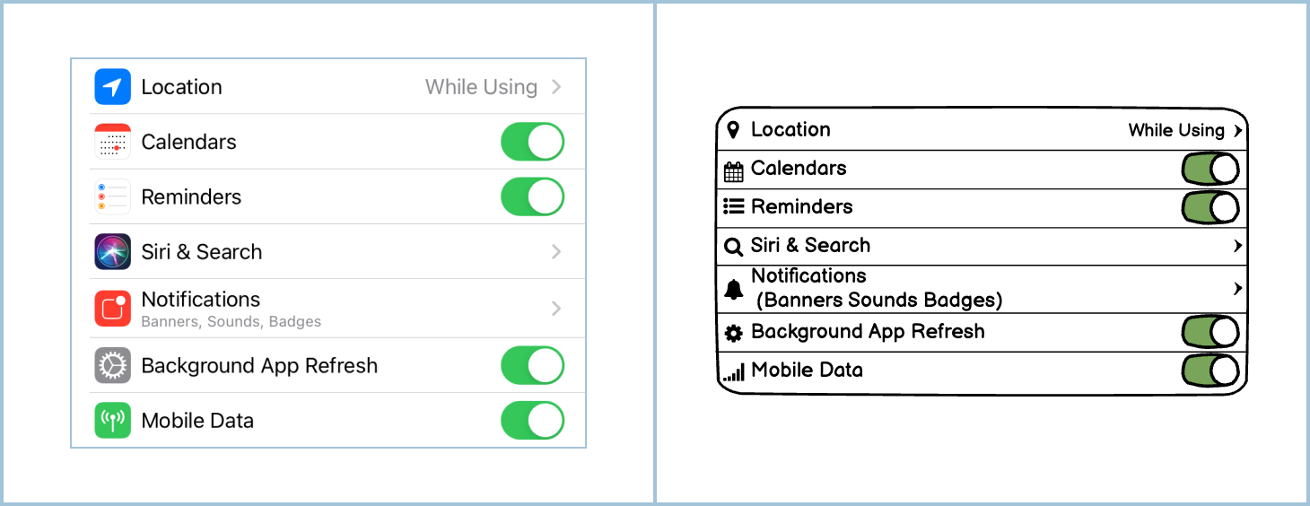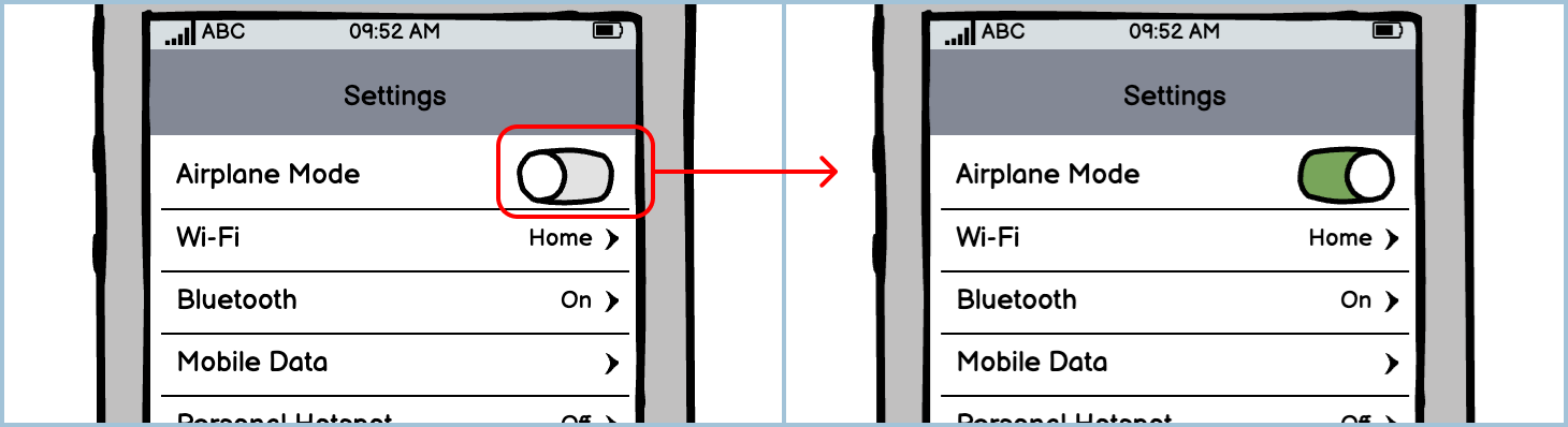 A toggle allows the user to turn a setting on or off by tapping it. An iOS toggle is set to the right-hand side of the phone, making it easier for right-handed users to interact with it.