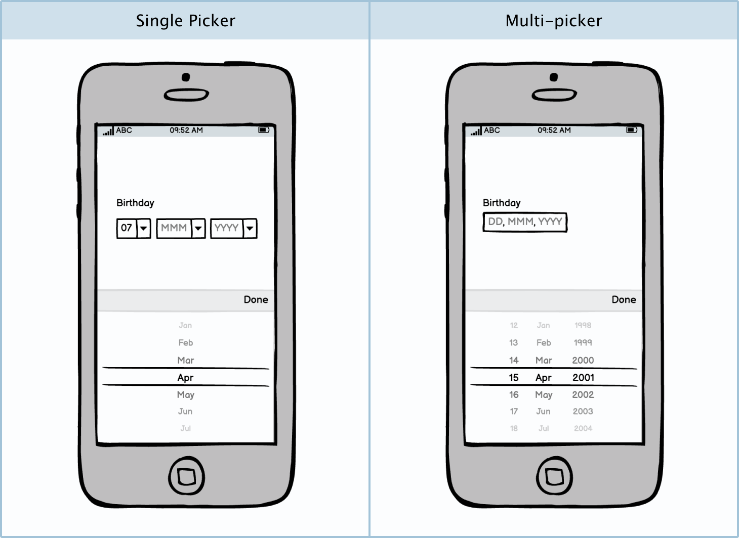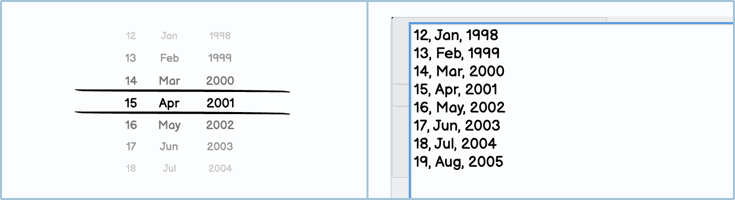 Another feature of the iOS picker is that it can contain multiple dropdowns or selectors in one display. This is very useful for selecting time, dates, birthdays, etc.