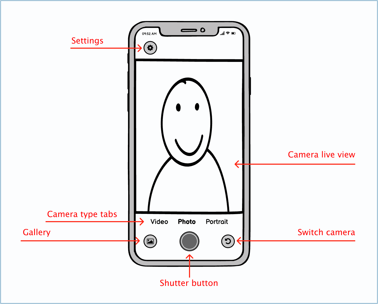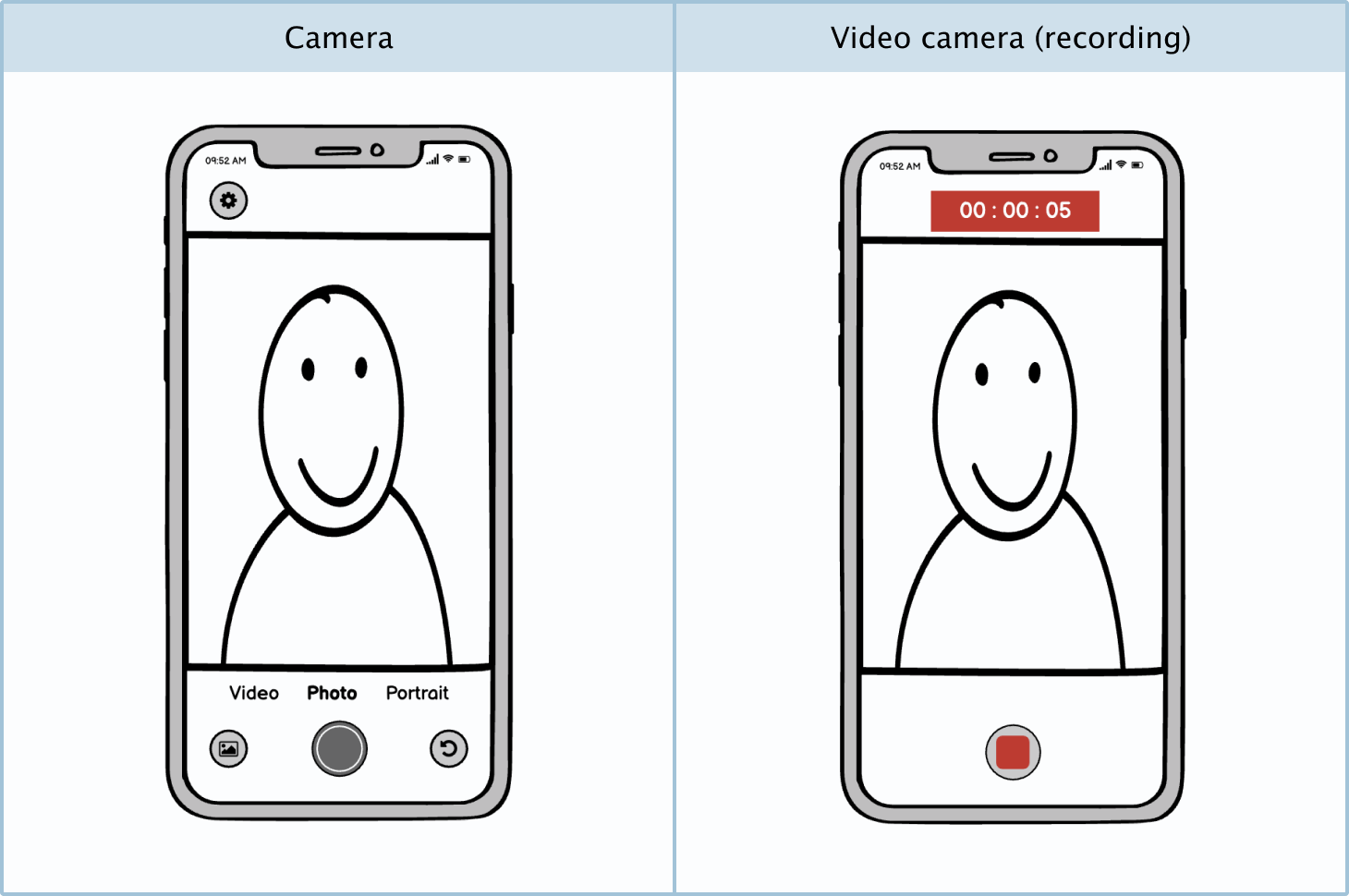 Camera and video camera mobile app: You can create your own camera apps in Balsamiq using a phone template, the webcam image, circle buttons, shapes, and labels.