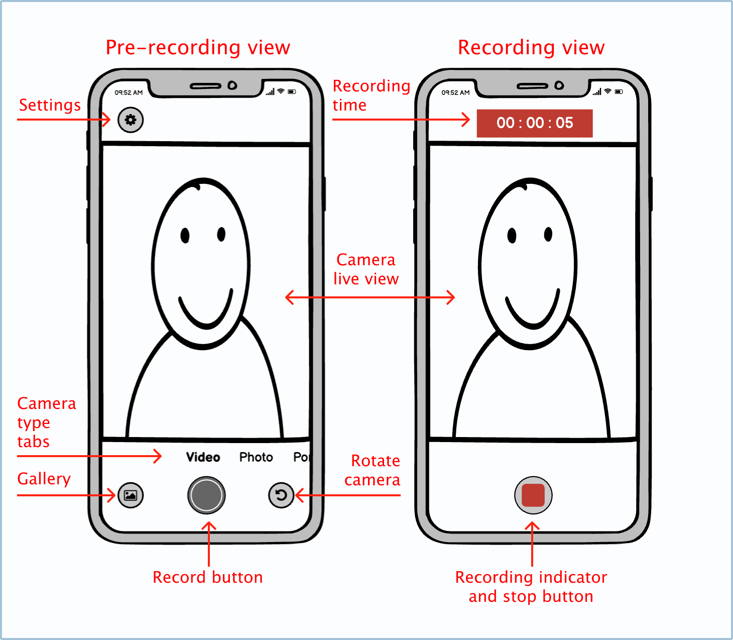The "pre-recording view" is very similar in appearance to the camera view. However, while recording, the user will see a readout of the recording time and a red indicator letting them know that it’s currently recording. The user should be able to click the square "stop recording" button when they are done.