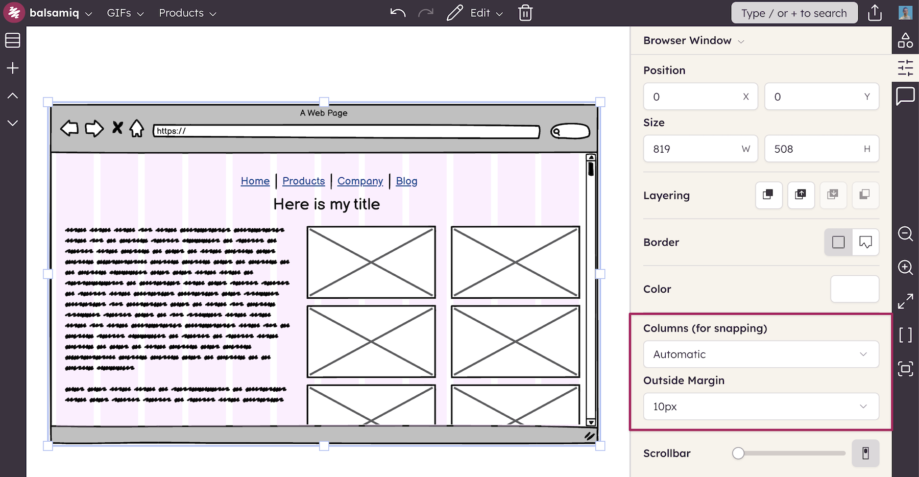 For controls that behave as containers (e.g. Browser Window, iPhone & iPad, Rectangle, and Tabs) you can snap to a grid of columns inside each control. You can choose 1, 2, 3, 4, 6, 8, or 12 columns. Selecting Automatic will choose the appropriate number of columns based on the size of the control.