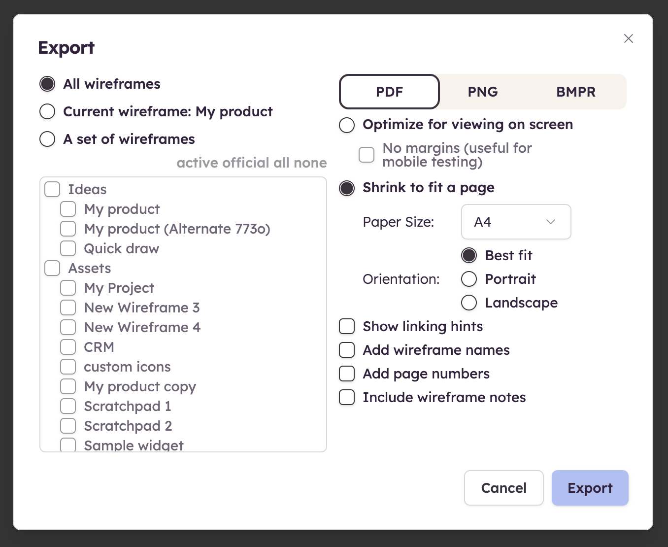 You can choose to export all wireframes or a subset, including any alternates you have created.