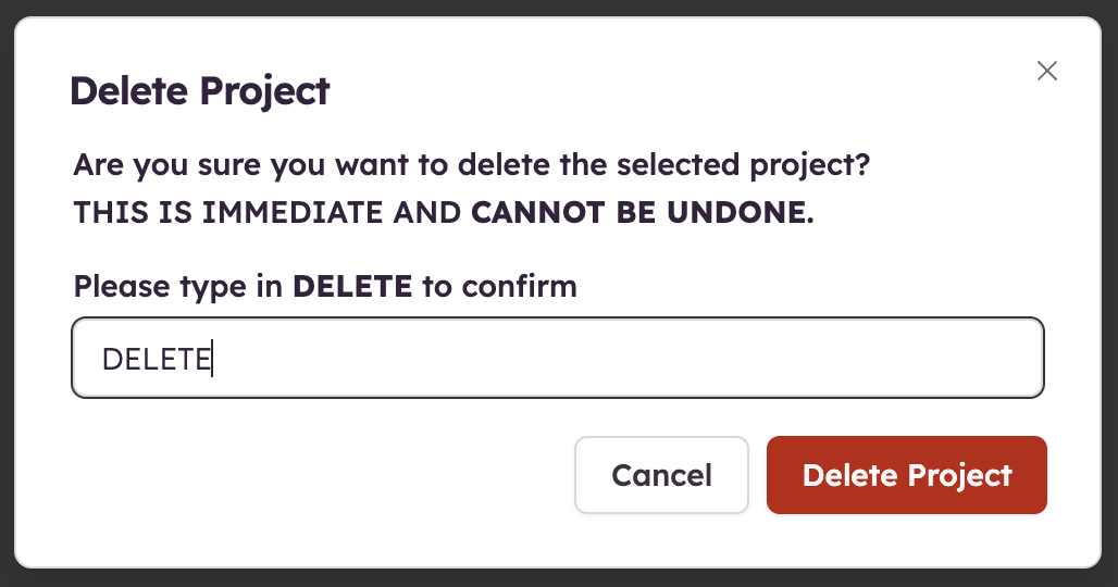 You can also delete projects from the Project menu. You will only need to type "DELETE" in the dialog box that appears.