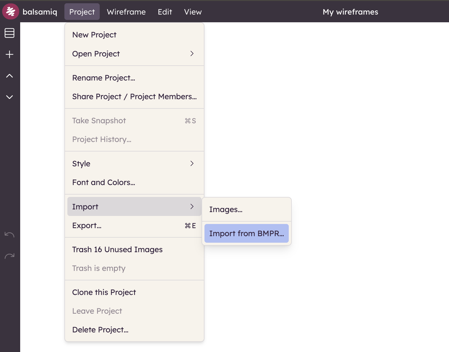 If you have existing Balsamiq (.bmpr) files, you can use the "Project > Import > Import from BMPR.." option to import them into a new or existing project. You can also drag a BMPR file onto the canvas to import it.