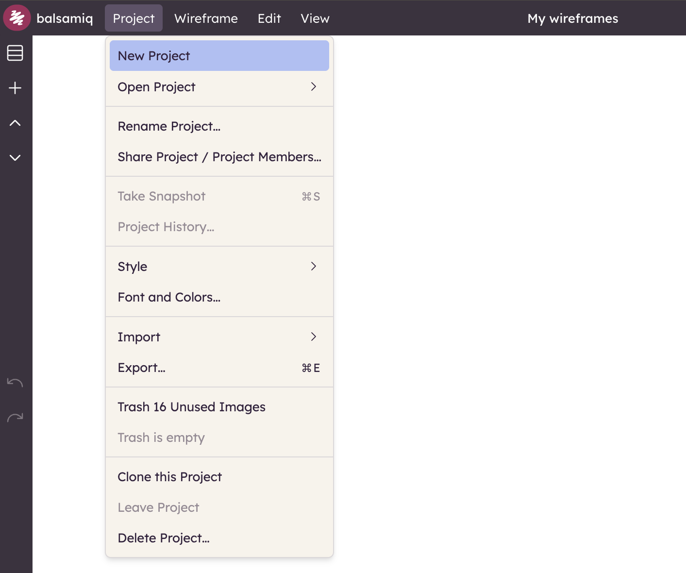 You can create a project from the Project menu in the upper-left corner. Click on "New Project" to start wireframing your new idea.