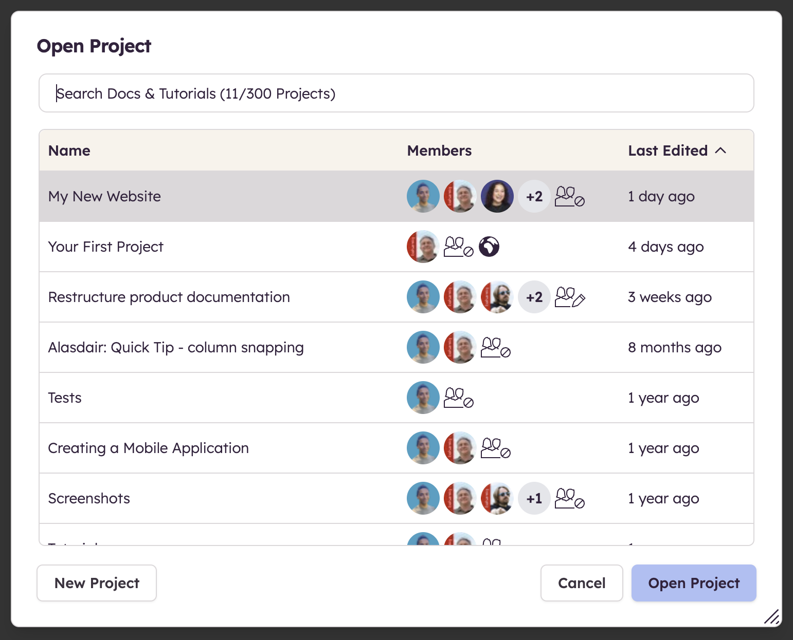 If you have more than 20 projects, the Open Project option will open your list as a new dialog instead. From there, you can search or open any projects, and create a new one.