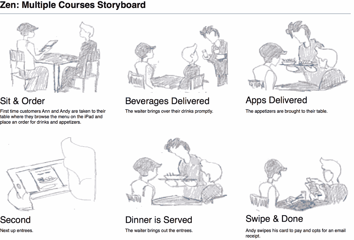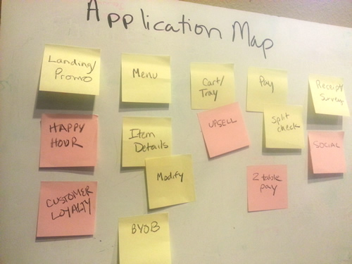 We used our research and design principles to guide the strategy session with the stakeholders. We looked at the pain points in the current customer experience and came up with some great ideas: rely on the iPads for ordering, but have hostess and waitstaff for seating and service, use up-selling in the menu to promote multiple courses, a mounted iPad for fast To-Go orders.