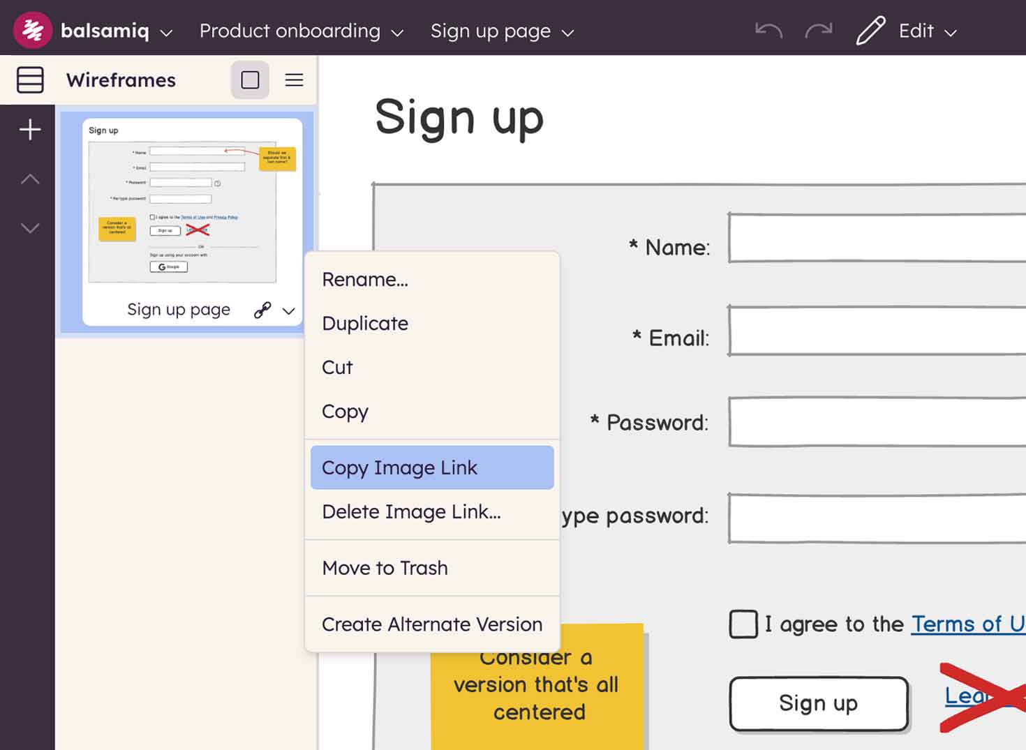 Open your project in Balsamiq Cloud and choose the wireframe you'd like to share. Click on “Create Image Link,” and the link will automagically copy to your clipboard.