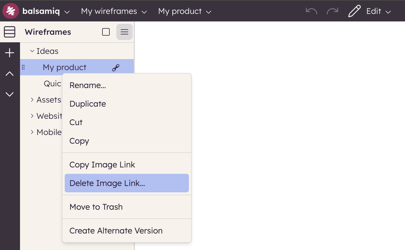 To create an Image Link, select the dedicated option available in the navigator panel's context menu for any wireframe and click on "Create Image Link".