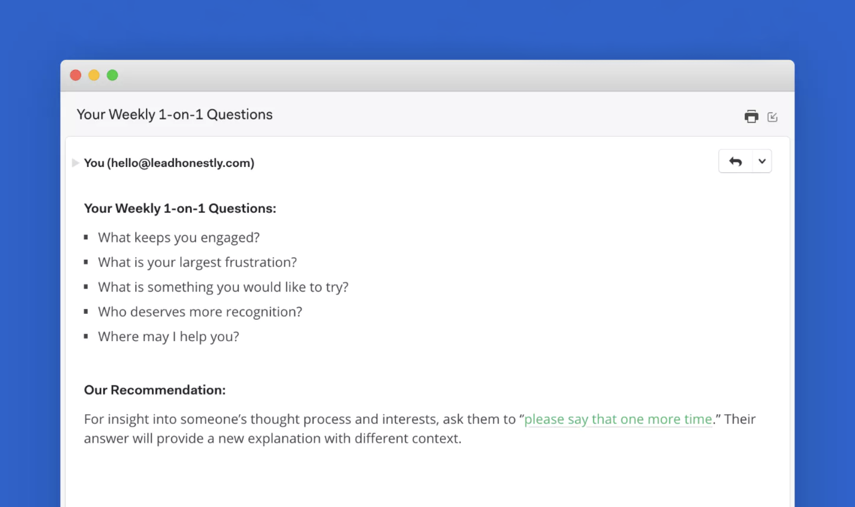 Lead Honestly allows managers to establish and create more meaningful relationships with their team members. It's a great tool for people managers who want to keep up-to-date with the pulse of each member, more easily and efficiently. It was born out of processes developed by leading product and development teams at a startup.