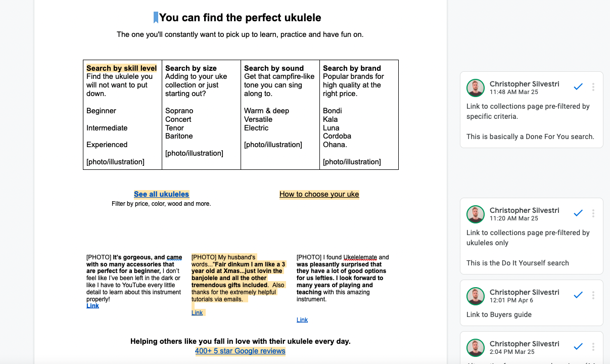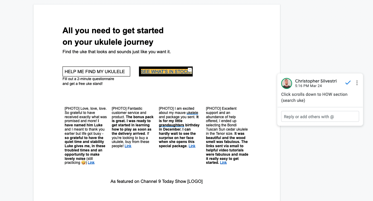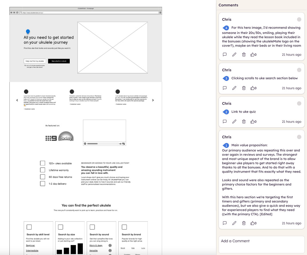 Often I will also add comments on the Google Doc to specific sections of the copy to provide more context. These comments can be anything from ideas on functionality or alternative copy and testimonials.