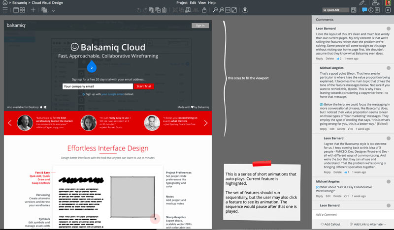 Wireframe of the Balsamiq Cloud landing page with annotations and comments from the visual design review.