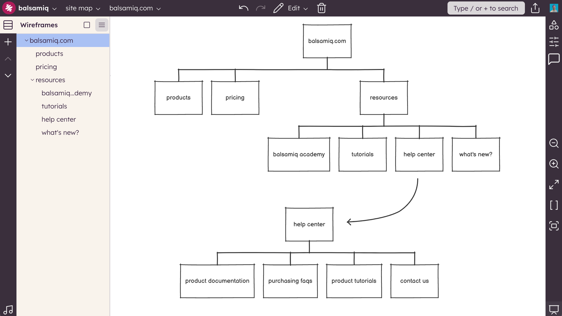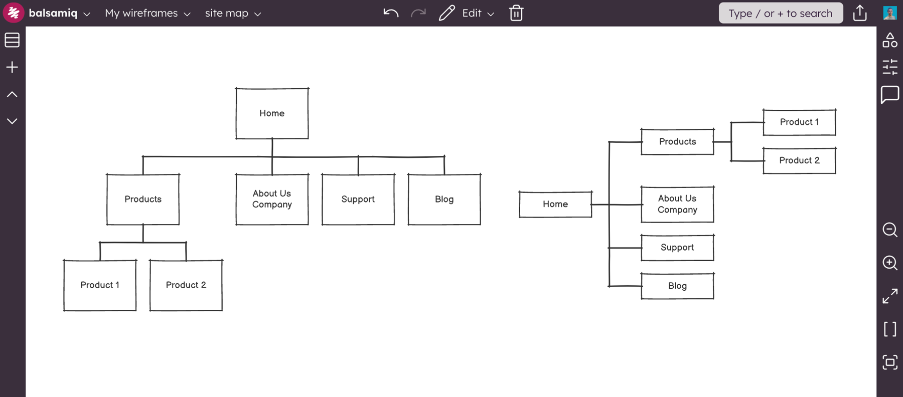If you are using a parent-child hierarchy, child wireframes will be shown as child nodes in the site map, as shown below.