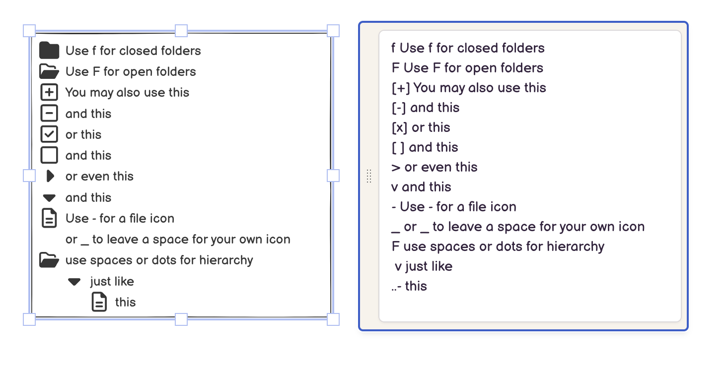 Note: Make sure to add a space between the icon indicator and the text after it (.e.g. "F folder name", not "Ffolder name").