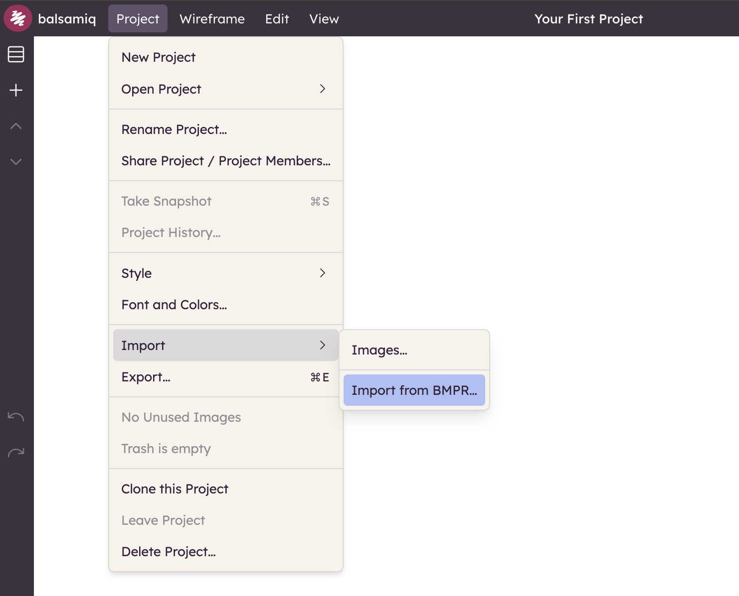 If you are transitioning from another Balsamiq version, you can drag and drop a project file on the canvas to import it or use the dedicated option in the Project menu.