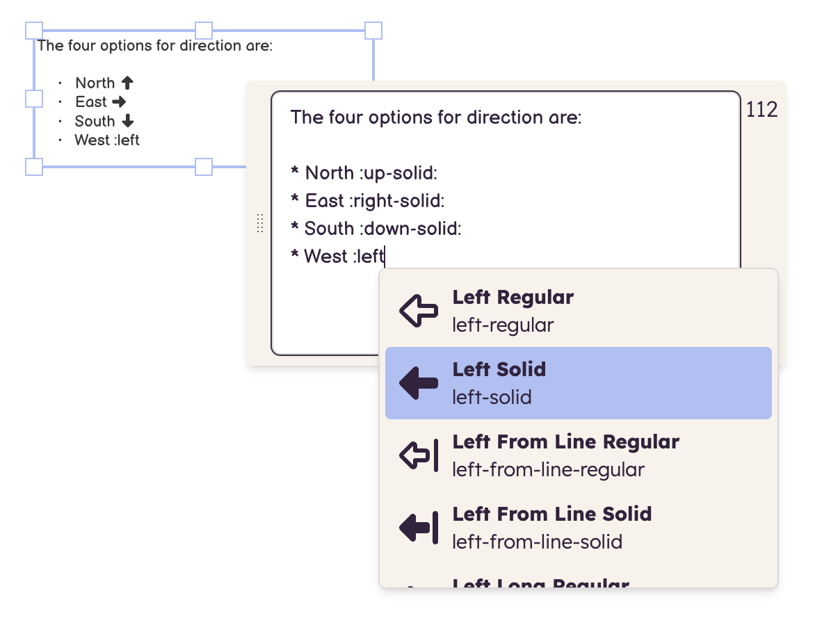 If you're not sure of the exact name of the icon, just type a colon then start typing an icon name. A drop-down menu will appear which matches your typing to the list of available icon names:
