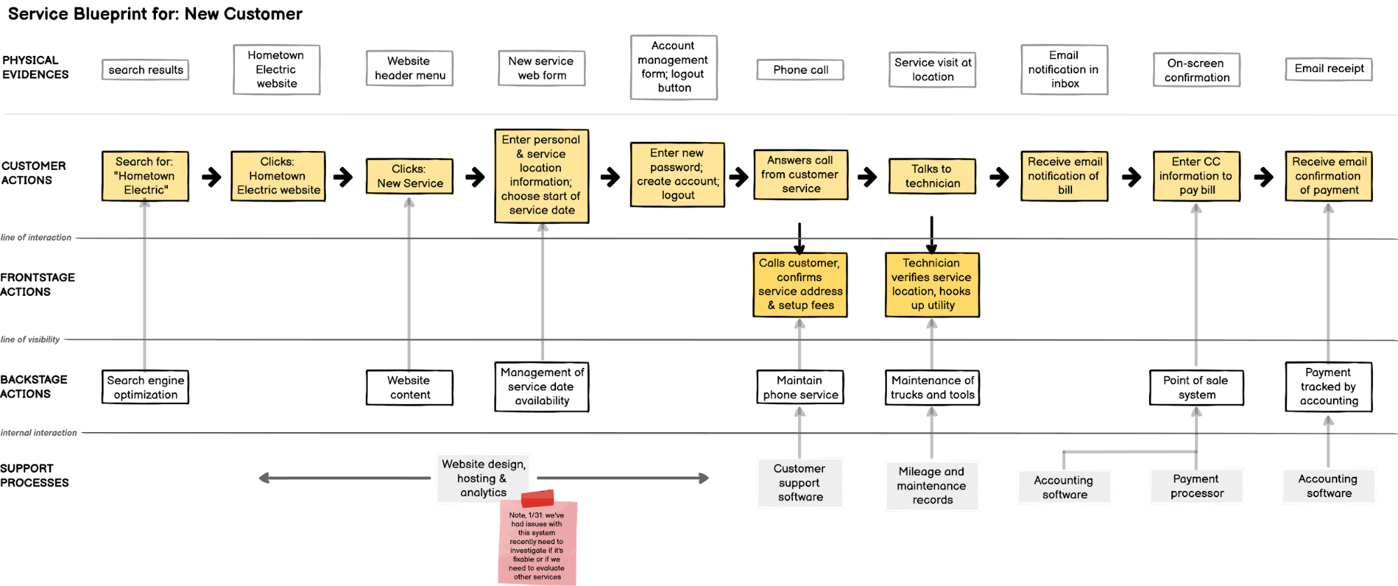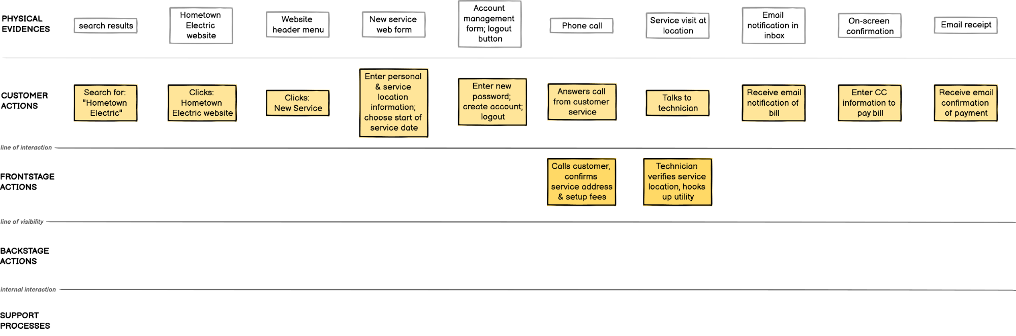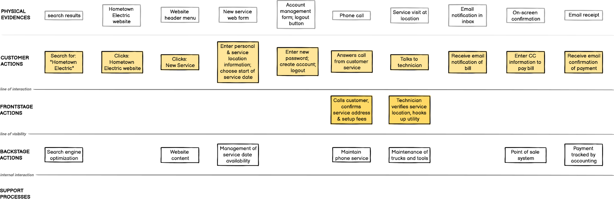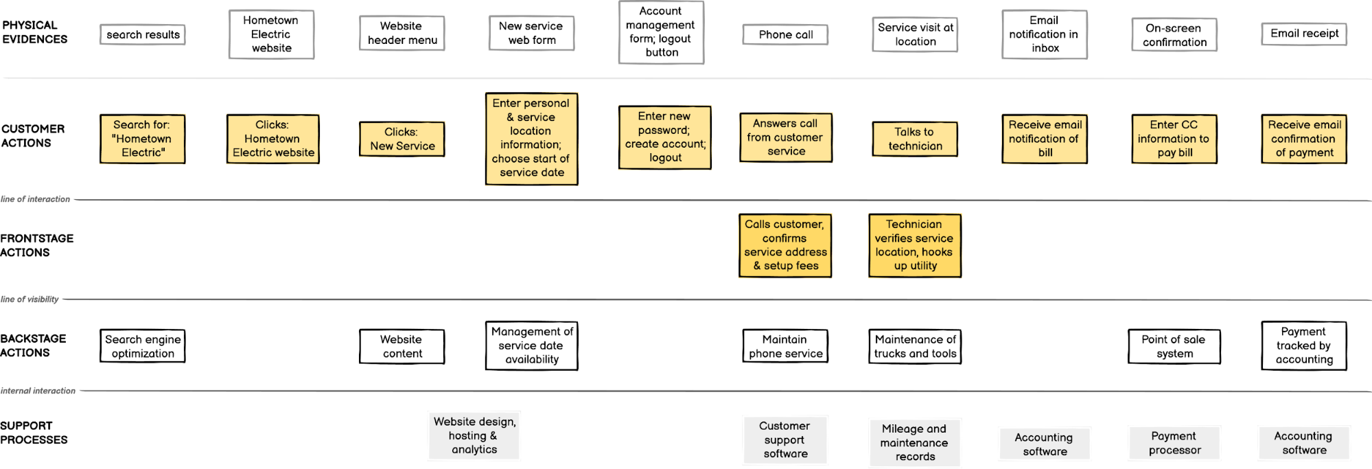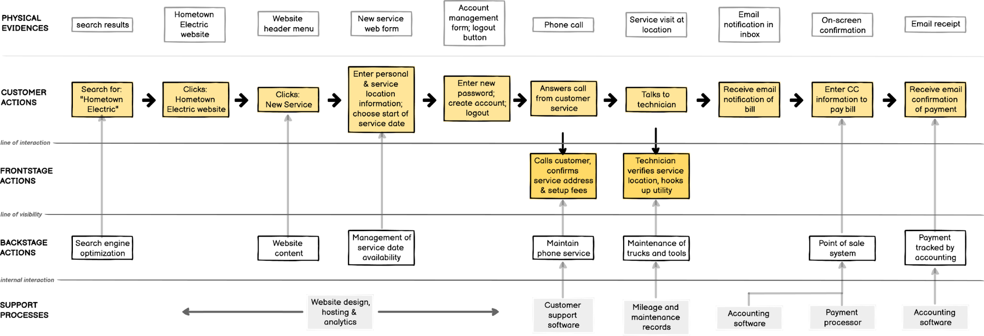 Behind all of those steps the electric company’s team: puts up the website, manages the software, operates the integrated payment system, schedules the service, dispatches the technician and maintains the utility lines. All of these other things that must happen to get you new electrical service and allow you to pay your bill — mapping this all out, that’s the service blueprint!