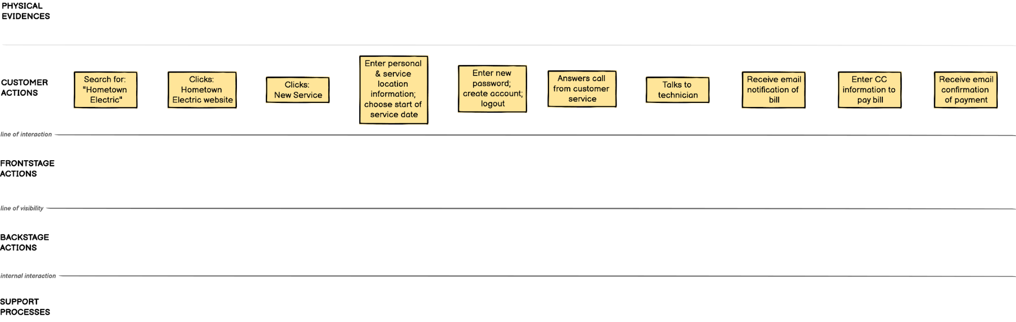 Although you may create your service blueprint for a different service or product, let's take a look at an example of simplified customer experience with your local electrical company from a service blueprint perspective. The user flow would show a customer searching online for the electric company, signing up to start service, creating an account, confirming the service setup date and then once service started, paying the regular bills for the electricity.