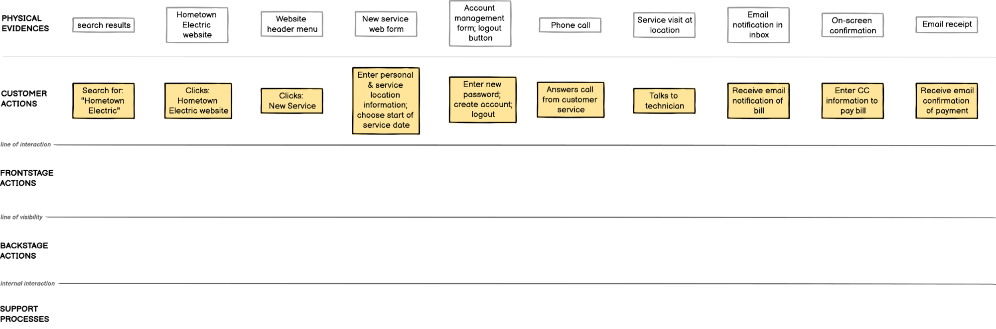 Note: You can find this outline, as well as the completed example, in Balsamiq. Just search for "Service Blueprint" using search.