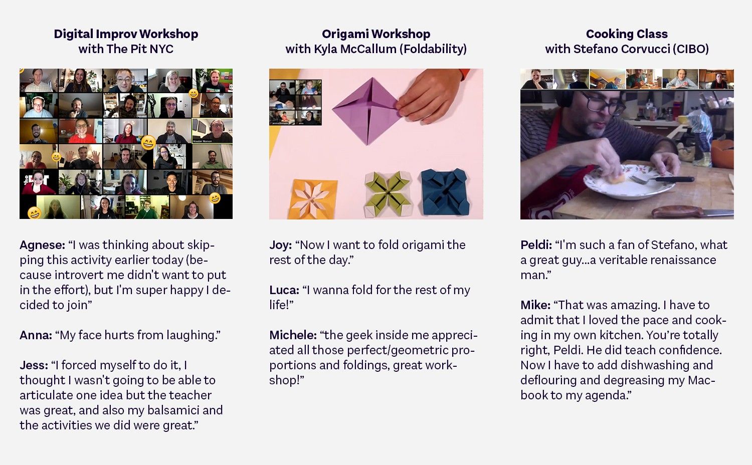 - Expertise: Leading some activities like an Improv class can be challenging and scary. Professionals are used to dealing with these situations, which are especially hard to manage remotely.