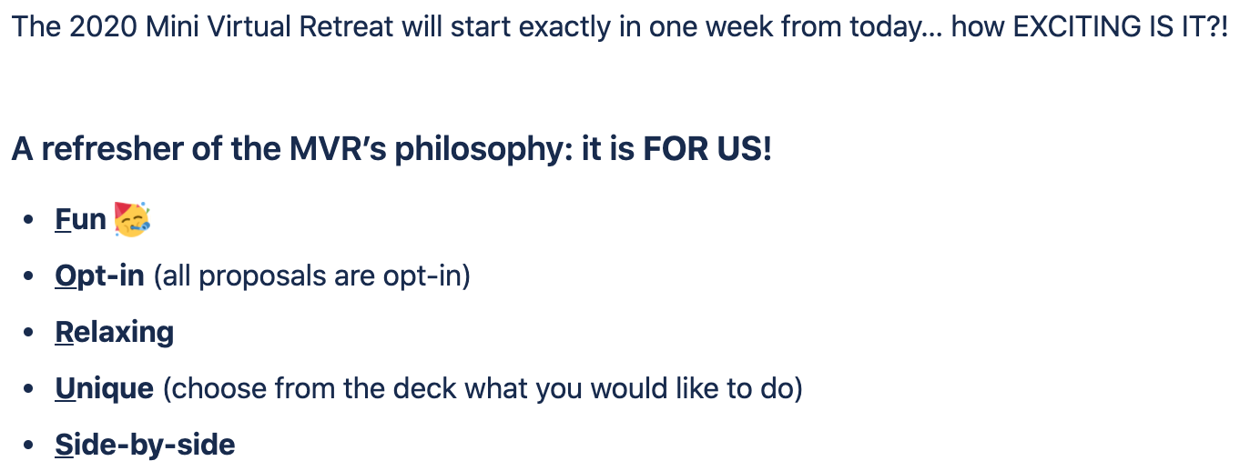 We knew what worked perfectly for us during our previous virtual retreat. There was no reason to change out all the elements. As participants had already experienced a successful virtual retreat, we wanted them to feel comfortable and not get lost in unnecessary changes to the format.