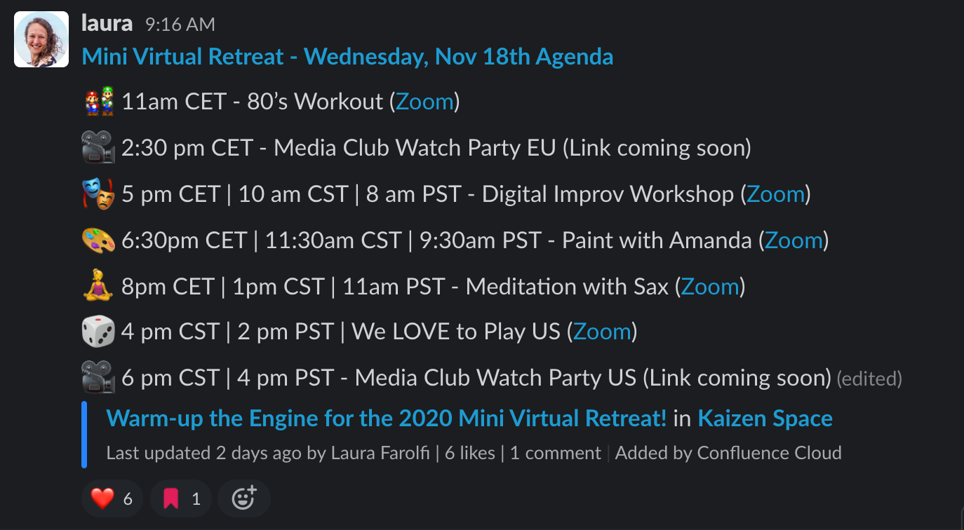 The communications plan didn’t change much: we had the overall event overview on Confluence, each activity had its own descriptive page linked from the official agenda, and a dedicated Slack channel for the event (which was quickly flooded with chitchat, photos, jokes, and party time).