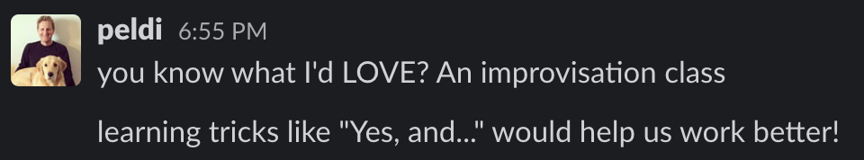 “No work activities” didn’t mean we couldn’t use the time together to learn skills useful for our professional life. Peldi shared his proposal for an activity with a deliberate possible learning outcome:
