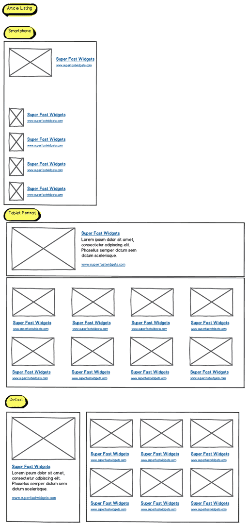 Using either of these techniques, you can lay out a page that starts to give an idea of how the content flexes with your target screen resolutions. In the example below, I used Technique #1 to make the header symbol and Technique #2 to make the Article Listings.