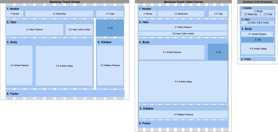 Now we have the start for how our responsive layout system should work between the 3 screen dimensions we targeted above. From here we can work our way in to identify how boxes should lay out within the template.