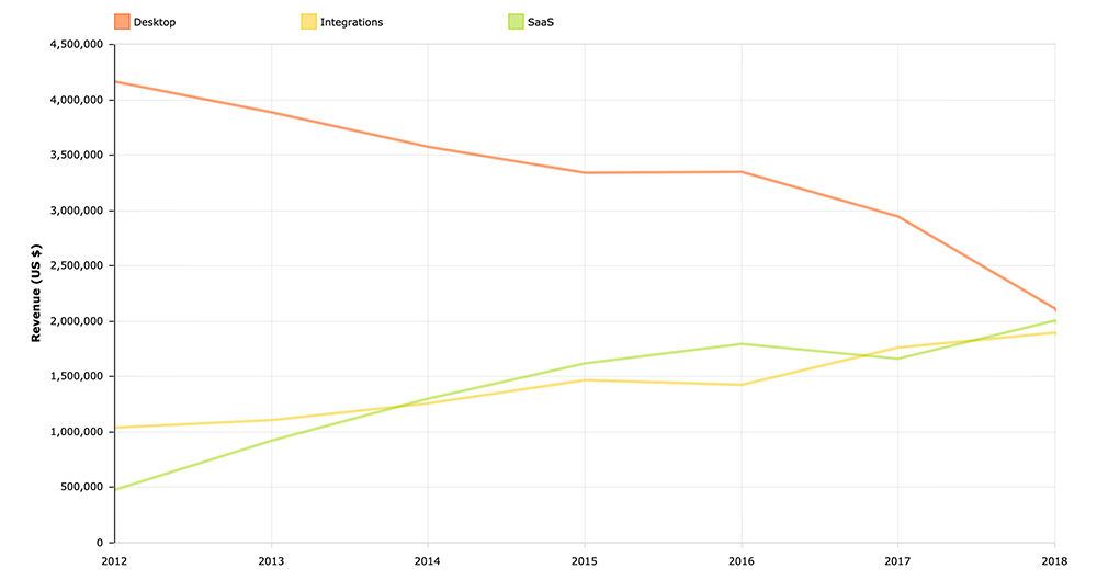 The Desktop revenue decline is due to the fact that, as you know, we've been focusing most of our efforts towards the new, fully-rewritten native versions of our desktop apps. We had hoped to release those at the end of 2018, but, as always in software, it's taking longer than expected. We're reaching the end of the tunnel now, we should be able to release in the next couple of months!