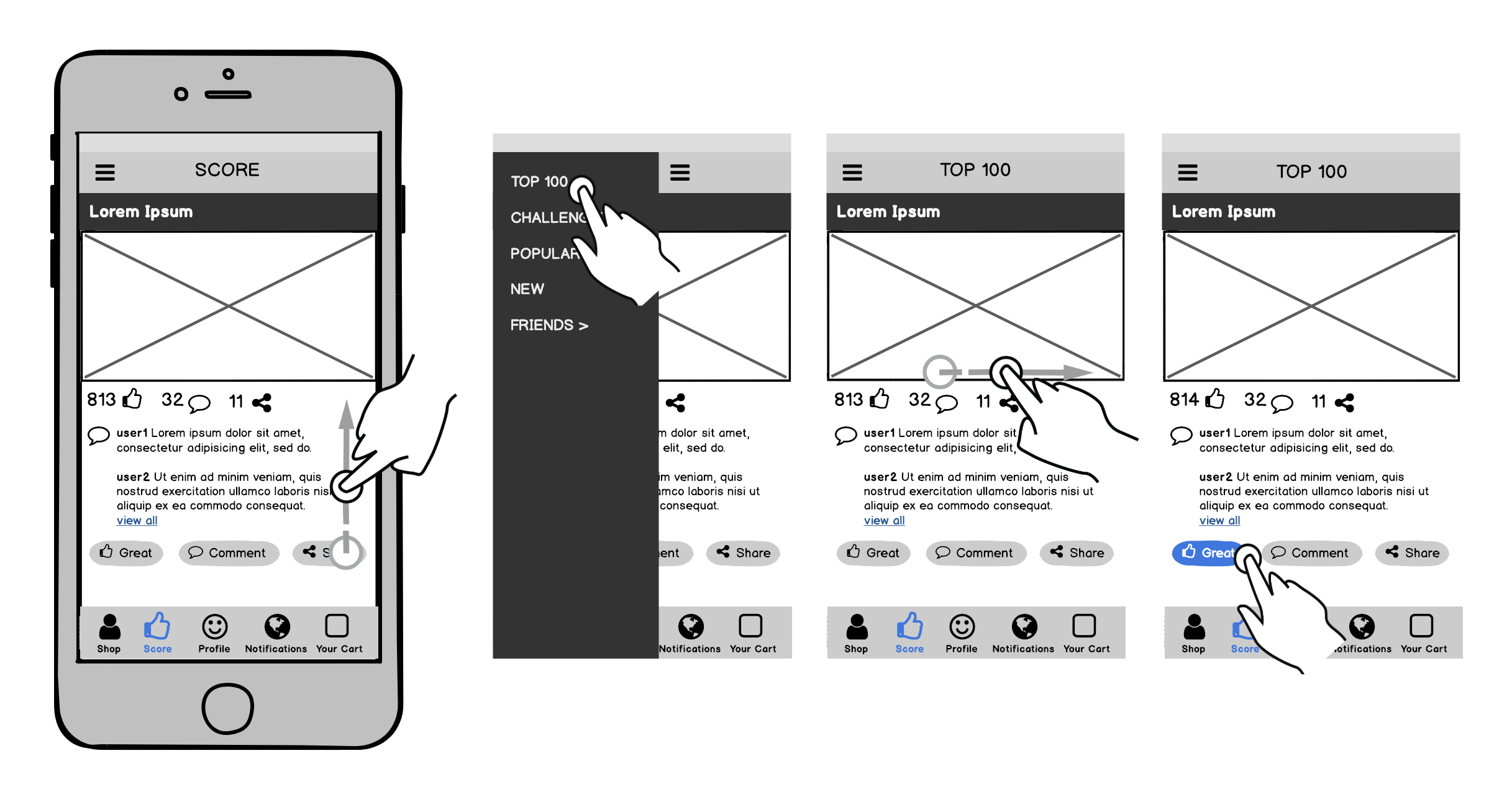 In this wireframe, I have broken out the interaction by the Score Tab, as well as added gesture images to convey my intended interactions by the user.