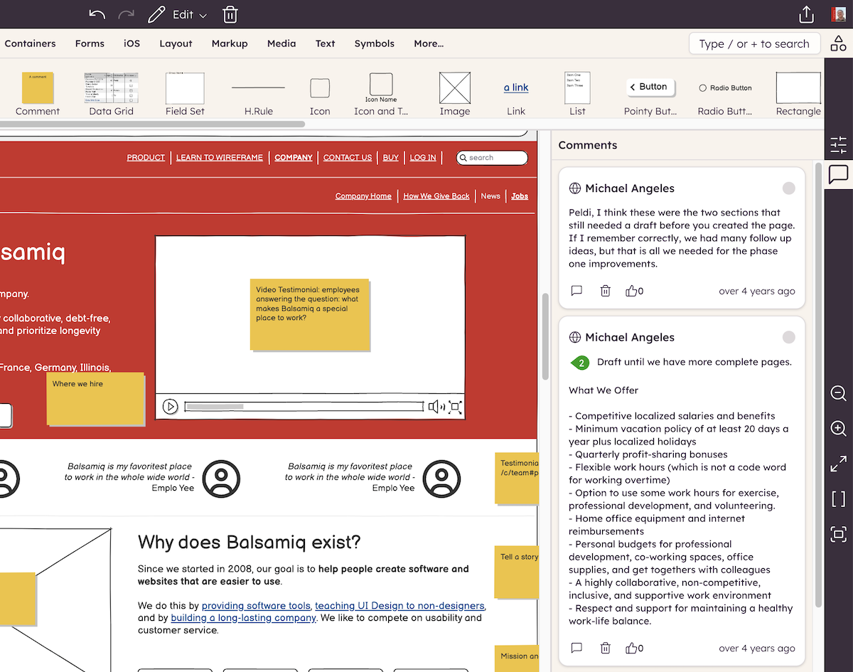 In these cases, you might want to schedule a co-designing session with your peer: you both open the same Cloud project, and use Balsamiq Cloud’s real-time collaboration features to riff on the wireframes together. You’ll be able to see what the other person is doing – what wireframe they’re editing, and what they have selected – and comment in real time, all inside Balsamiq Cloud.
