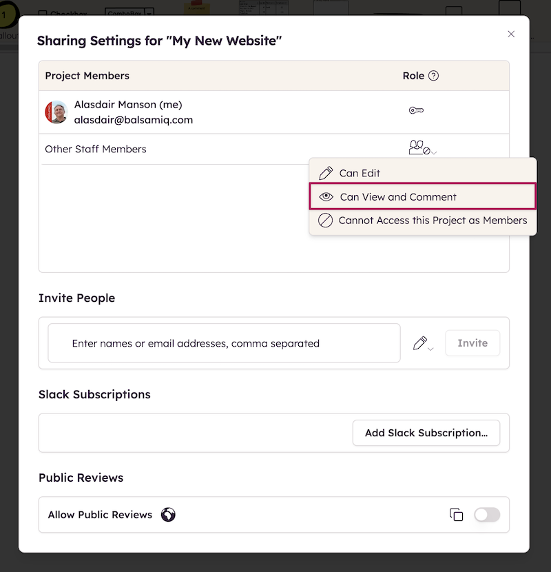 - You can “Allow public reviews” on your project – this will make it accessible to anyone who has the link, even if they don’t have a Balsamiq Cloud account. They’ll be able to navigate through it and add comments.