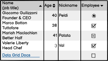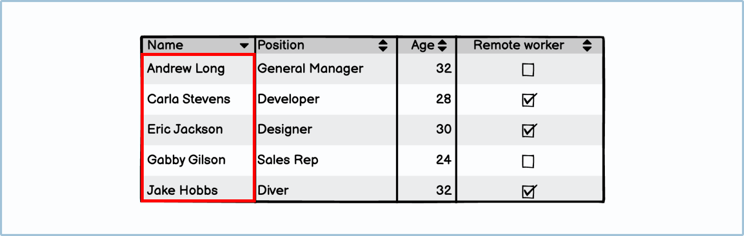 Text cells are table cells with regular text. This could include names, job titles, eating preferences, etc. If users were to click sort, they would see the table’s rows reorder in alphabetical or reverse-alphabetical order..