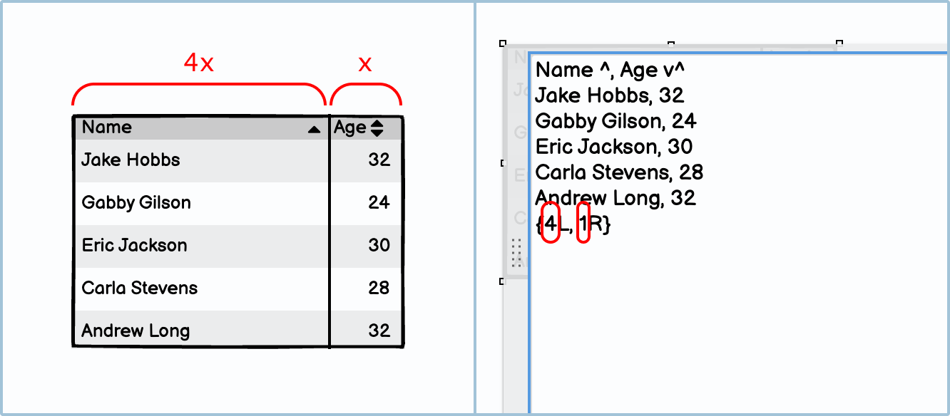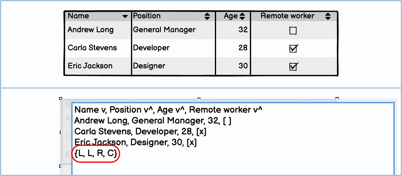 How to in Balsamiq In Balsamiq, you can left, right, or center align your columns using some shortcode. In the below example, you can see how the last line of the shortcode relates to the alignment of the different columns: "L" means left, "R" means right, and "C" means center.
