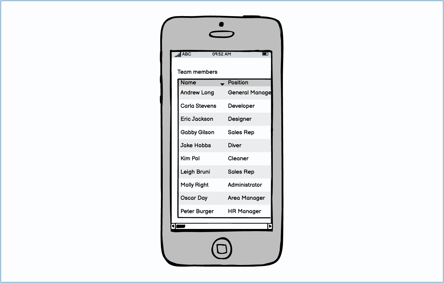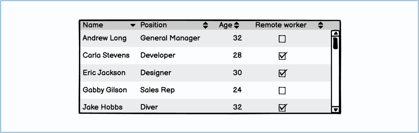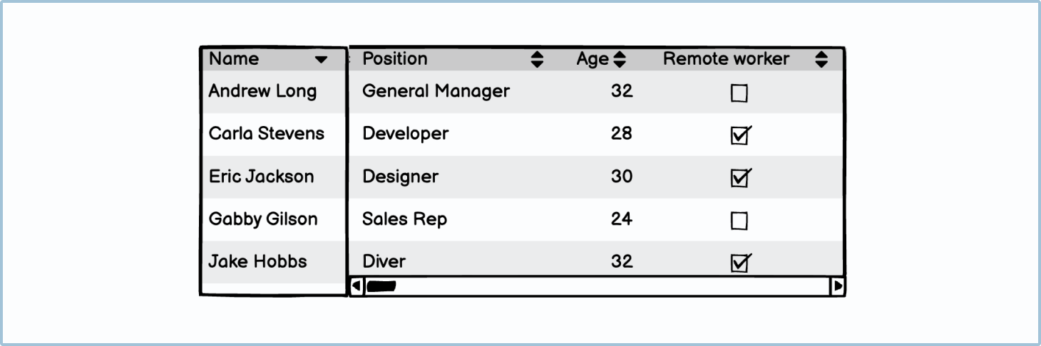 When you have a table that has a scroll, it’s recommended to always make the header fixed (or frozen). This means that as the user scrolls down, the header stays in the same place, making it easier for the user to navigate.