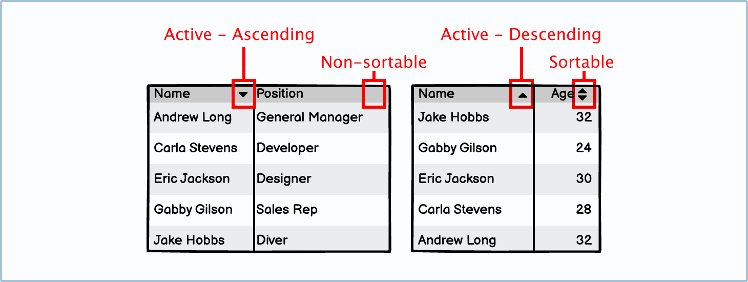 Non-sortable: If there aren’t arrows by the title, it means that the user can’t sort the table by that column.