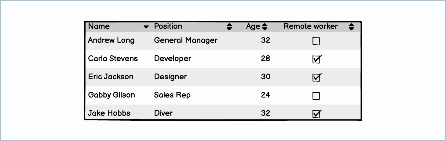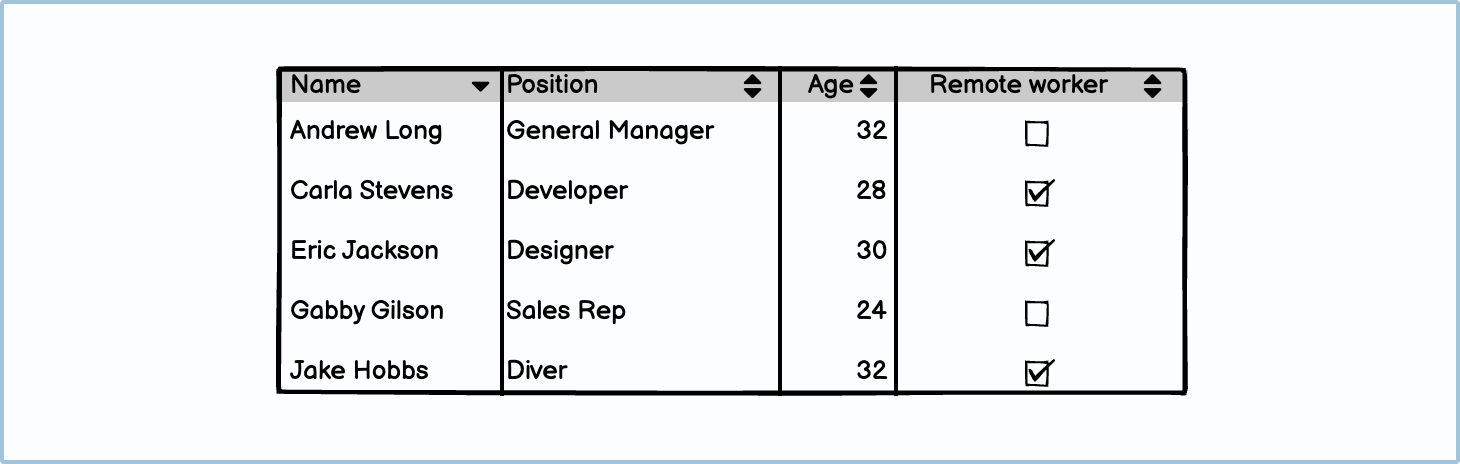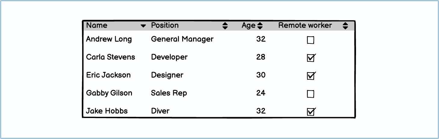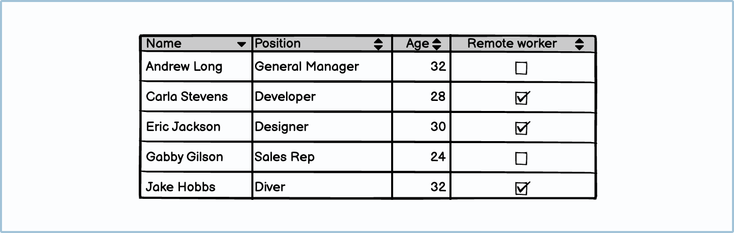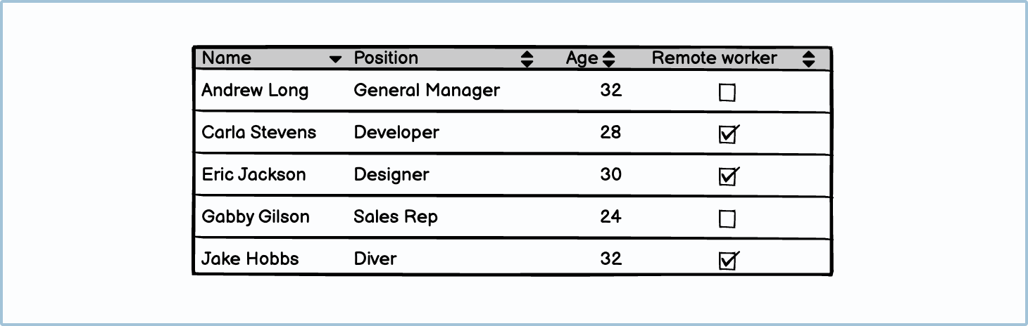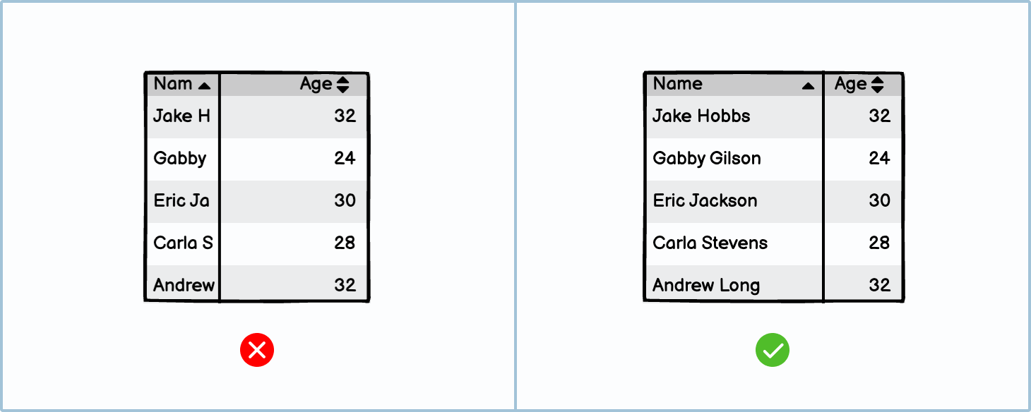 Tables should always be spaced according to the content within each column. For example, checkboxes and small numbers won’t need as much column space as a name or an occupation.