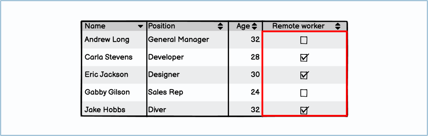 A checkbox cell is a table cell with a checkbox. A checkbox is a boolean variable that can only be "checked" or "unchecked" and less often "indeterminate." Checkboxes in the context of a table are often used to indicate yes/no variables such as whether a project is done, whether an invoice has been sent, or whether a team member is a remote worker. Sorting checkbox cells will group all the checked checkboxes at the top and the unchecked checkboxes at the bottom or vice versa.