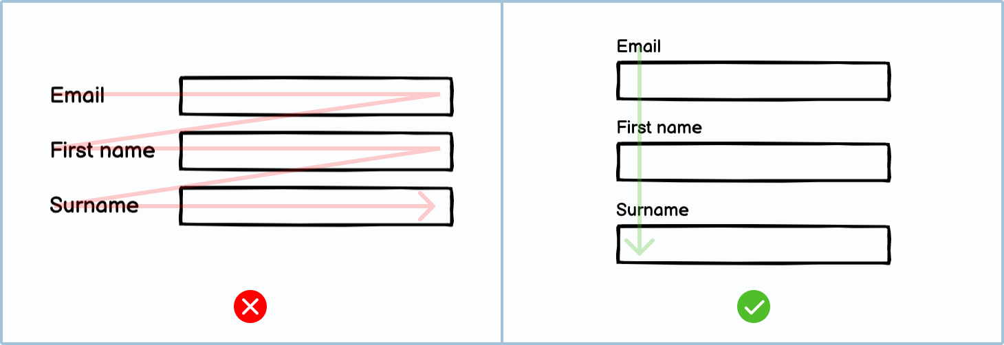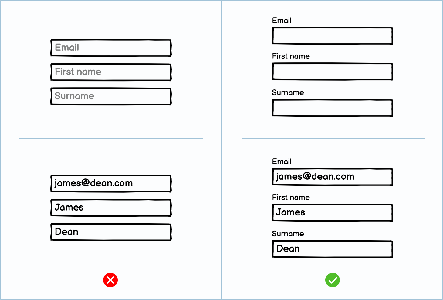 For input fields where the label is in the placeholder, it’s hard for the user to tell if they filled the right things in the correct order once they have completed the form. Instead, stick to text fields where the label is visible at all times.