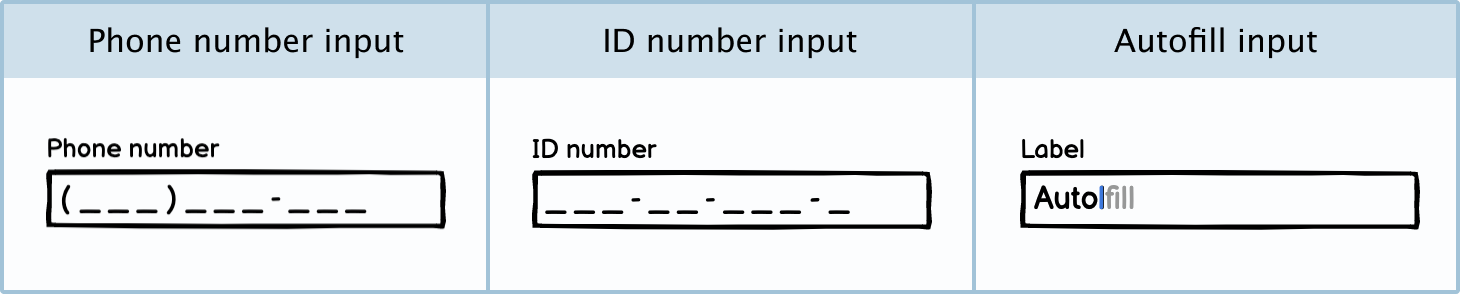 Phone number: Use dashes and underscores to indicate how long a phone number should be. If all your users are from the same area, consider pre-filling the first part of the number.