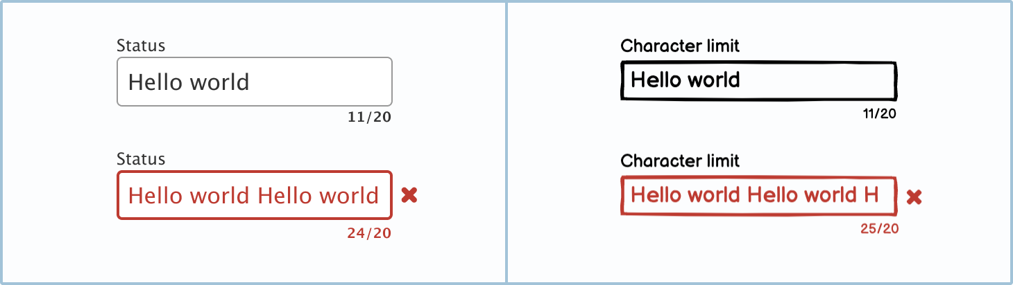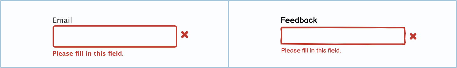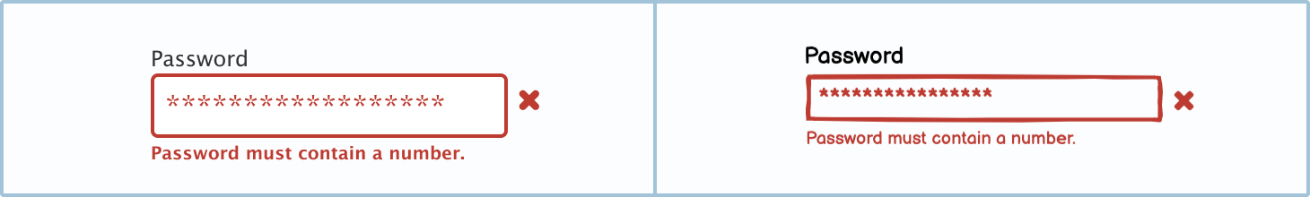 Tip When designing error feedback, always show the error using color (red), hint text, and an icon (cross). The icon’s addition makes it much more visible for users who have visual color impairments to spot the failed text input.