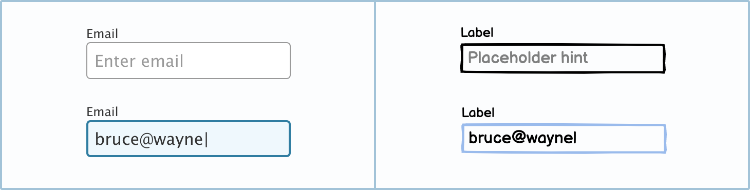 Placeholder hint text disappears as soon the user starts inputting text into the field. These hints are usually prompts or examples, e.g., "Enter email" or "E.g., joe@soap.com", etc.