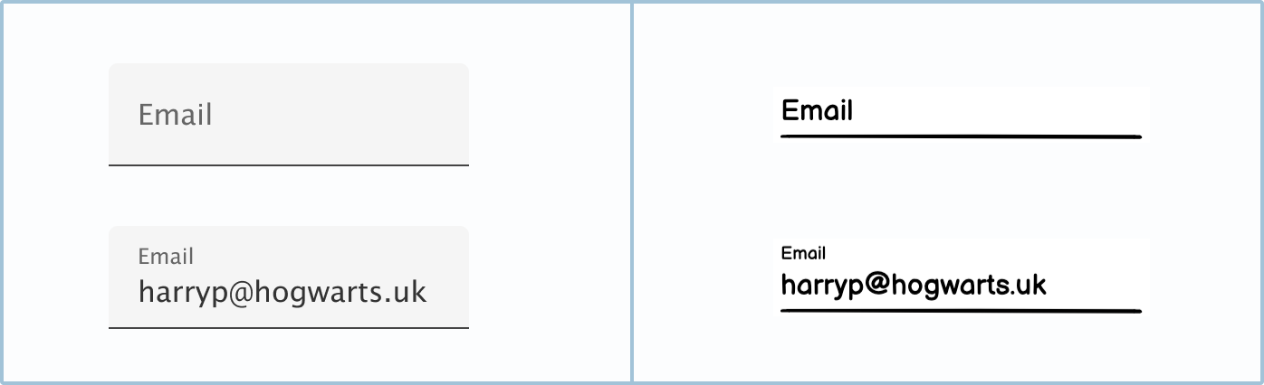 These text fields look very similar to the standard type, except that they use placeholder text as a label. While this is an excellent solution for space-saving, the usability isn’t great as the label disappears when the user inputs text.