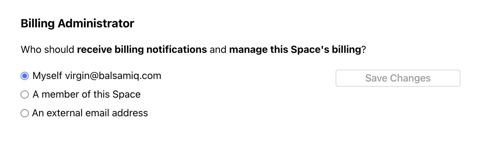 Under the Billing Administrator section, select one of the three options: myself, a member of this Space, or an external email address.