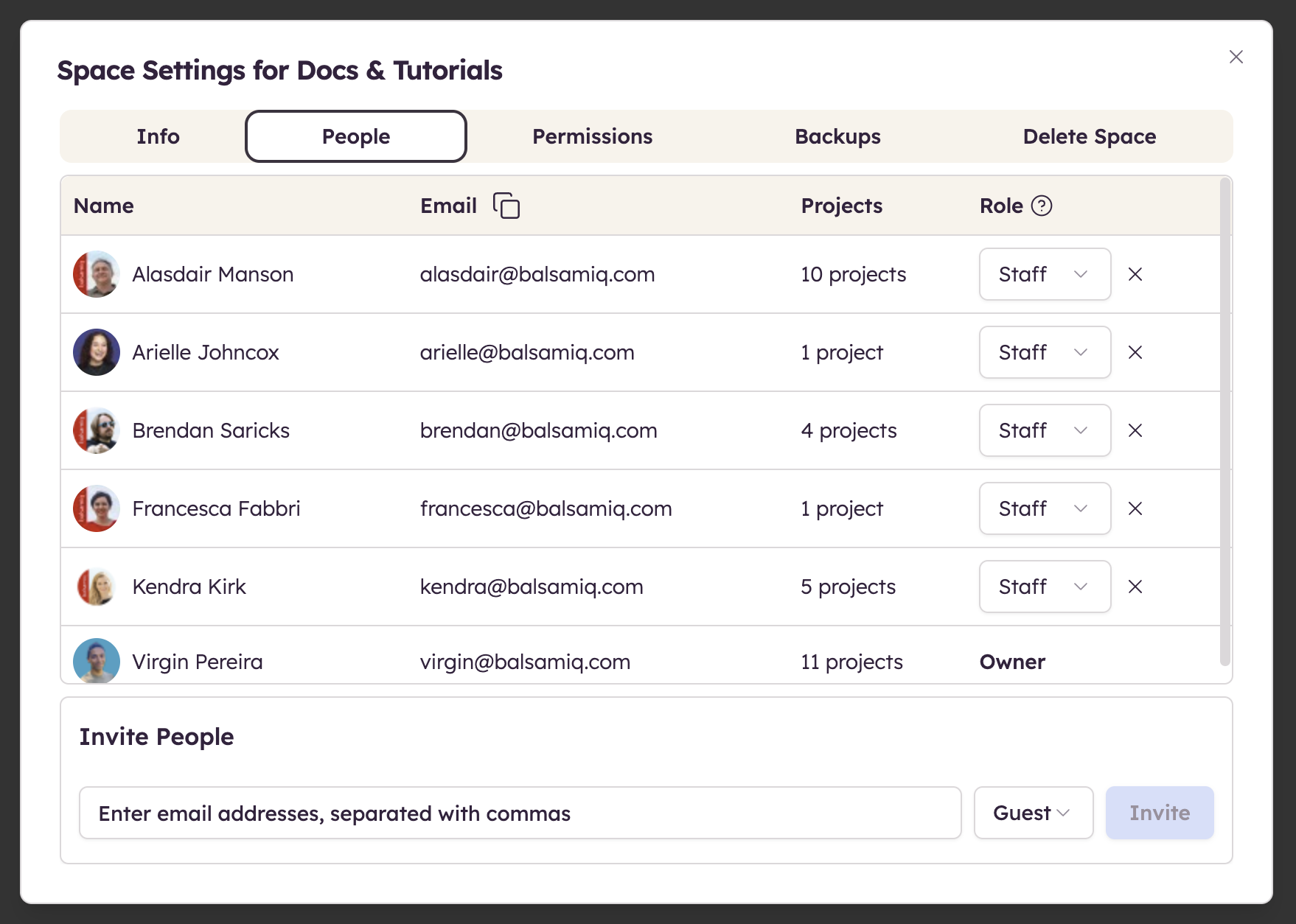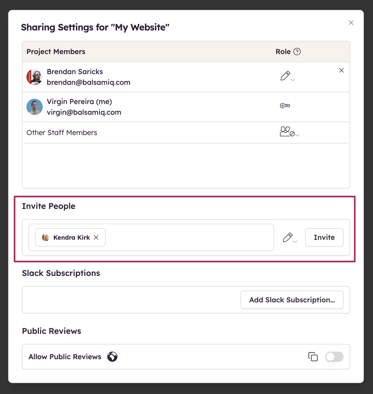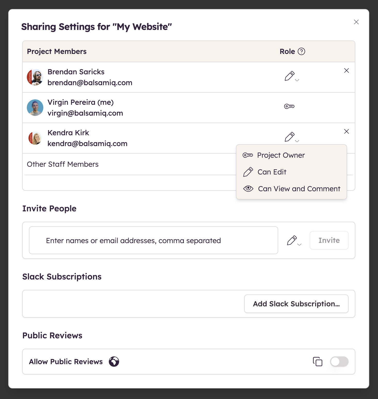 The Sharing Settings panel will appear and display a list of users and their permissions on that particular project. Project Owners and Staff Members can edit user permissions from the Role dropdown menu next to a user's information.