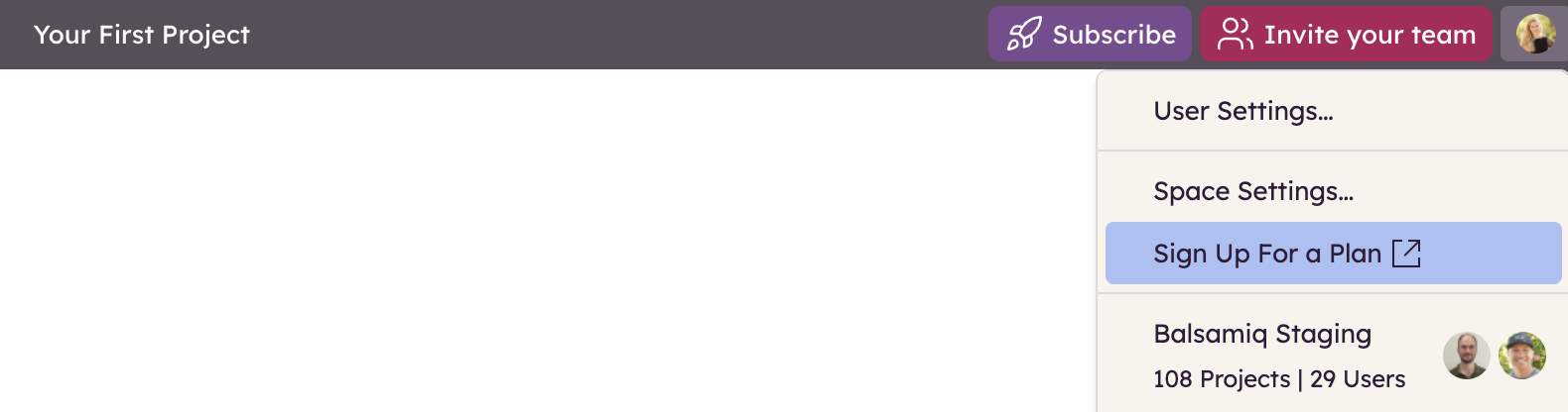 Space Owners can select a Billing Admin by clicking on the Subscribe button, or Sign Up For a Plan (or Manage Subscription if you already signed up for a plan) from the Avatar Menu in the upper-right corner.