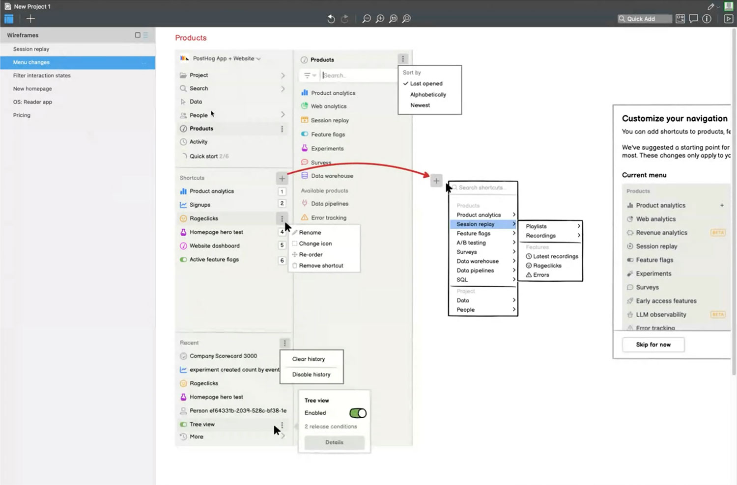For most projects at PostHog, Cory starts with wireframes. These vary between low-fidelity wireframes and what he calls “high-fidelity wireframes.” The latter are often made up of screenshots and wireframes layered on top, showing how different parts of the product or website experience could evolve.