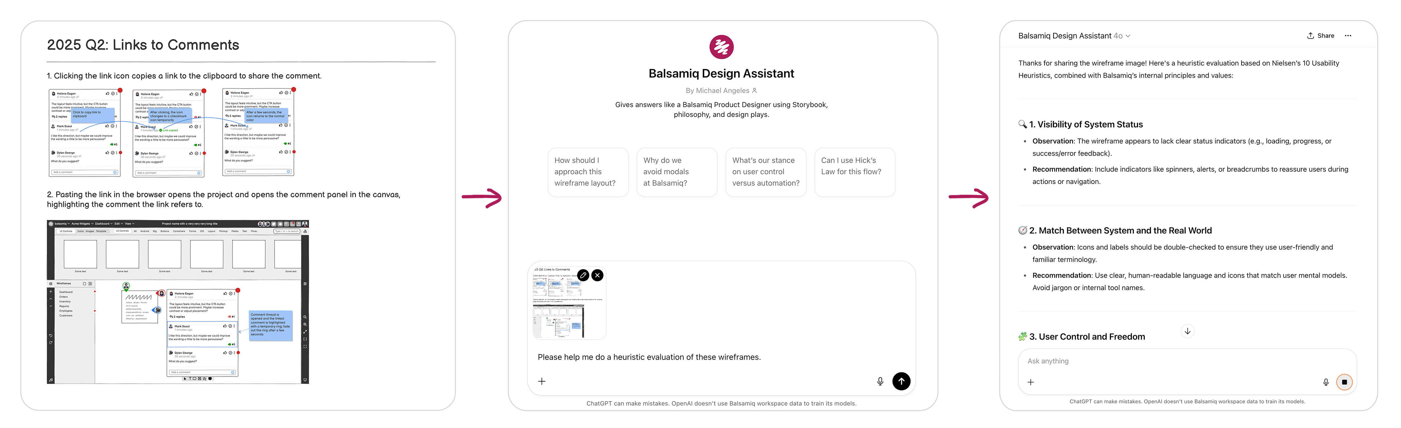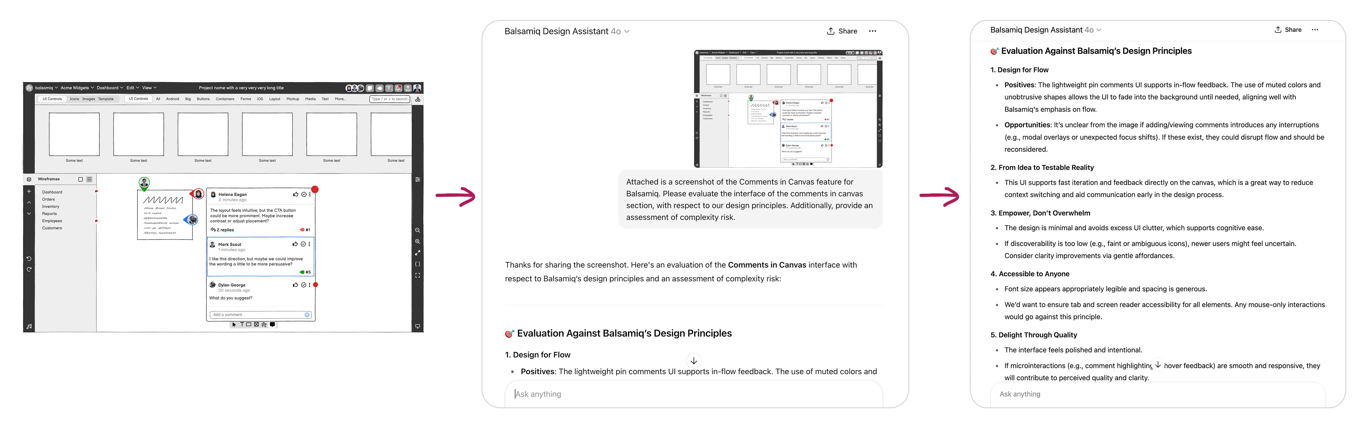 Three-step flow showing a wireframe with comments sent to the Balsamiq Design Assistant custom GPT, which returns an evaluation based on Balsamiq’s design principles, including clarity, accessibility, and user flow.
